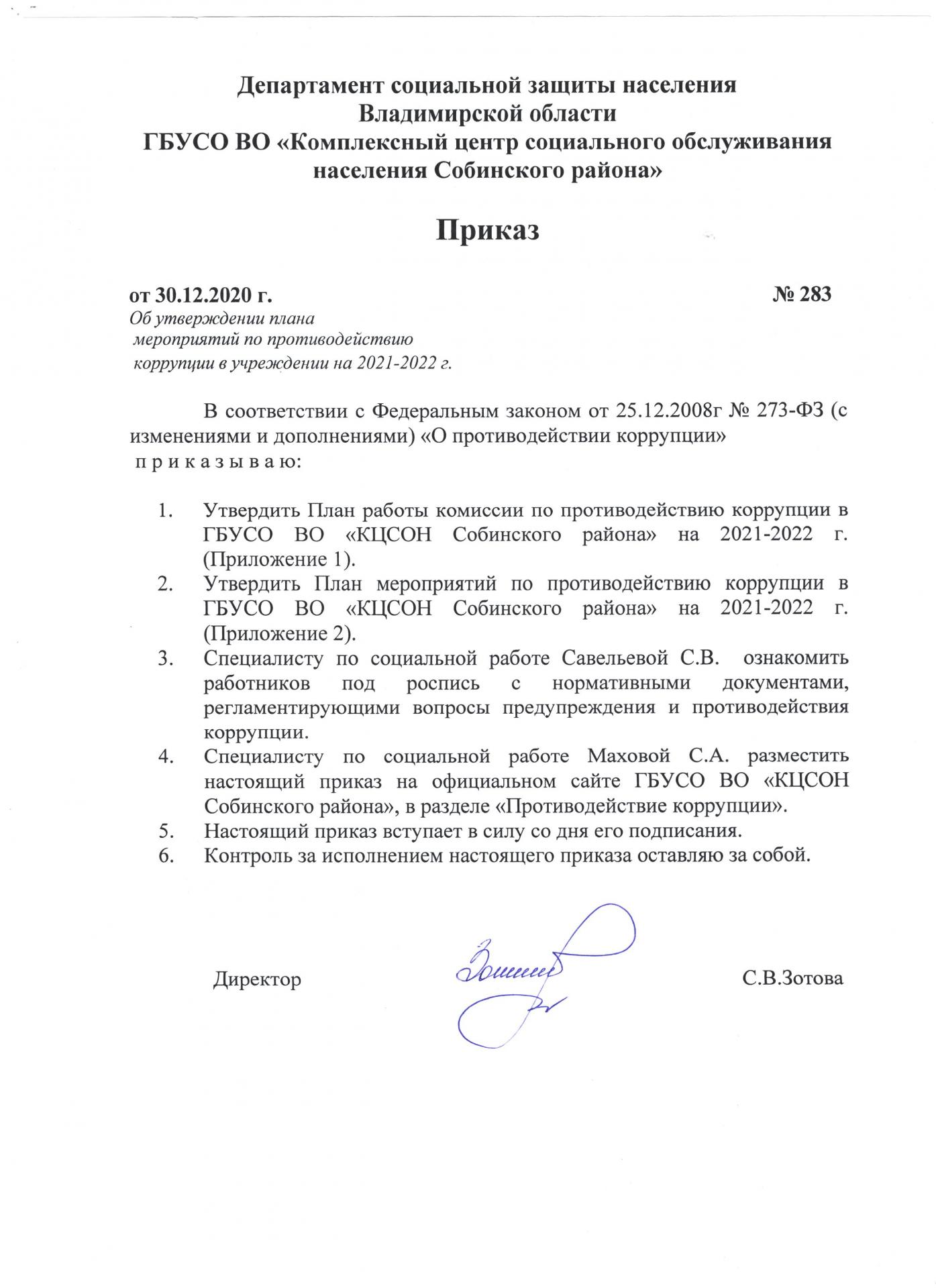 Приказ ГБУСО ВО «Комплексный центр Социального обслуживания населения Собинского района» от 30.12.2020 г. № 283