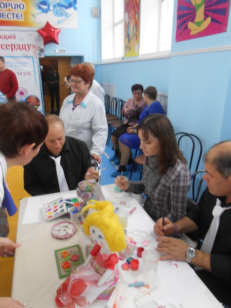Детей-инвалидов и молодых инвалидов ожидало обучение основам ручной росписи ткани под руководством художников ООО «Шелковая коллекция». После окончания мастер-класса по батику они попробовали свои силы в других интересных видах декоративно-прикладного творчества. Все ребята получили на память магнит-сувенир с логотипом акции. Участники делегации Собинского района, как впрочем и все другие, получили массу положительных эмоций.